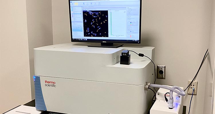 On the one hand, we have one ThermoFisher CellInsight CX7 for performing cell biology with automated high-resolution microscopy and robotic handling to extract the information from samples using several imaging modes (7-channel fluorescent imaging, 5-channel brightfield imaging, 7-channel confocal imaging).